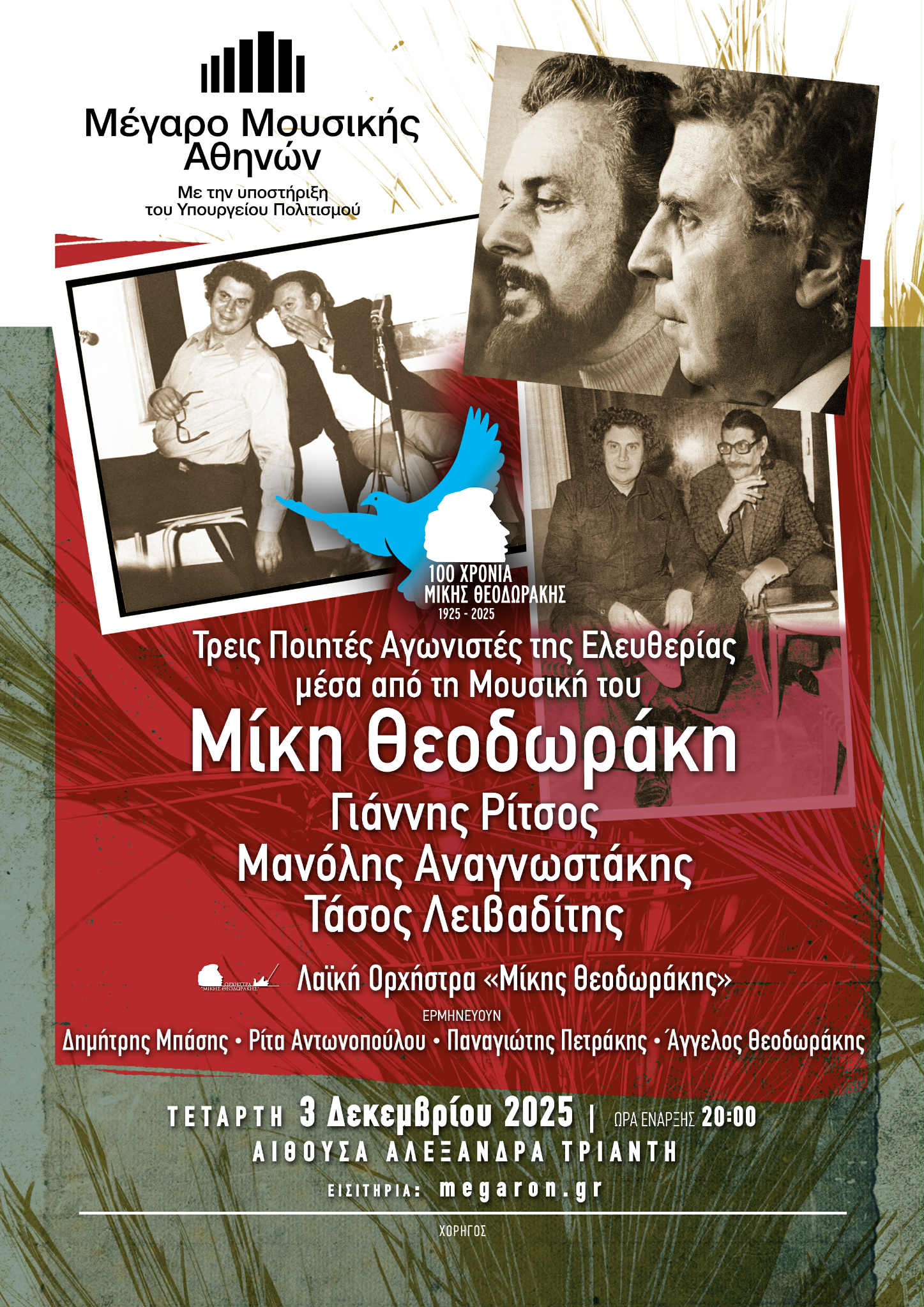 Γιάννης Ρίτσος, Τάσος Λειβαδίτης, Μανόλης Αναγνωστάκης: «Τρεις ποιητές αγωνιστές της ελευθερίας» μέσα από τη μουσική του Μίκη Θεοδωράκη