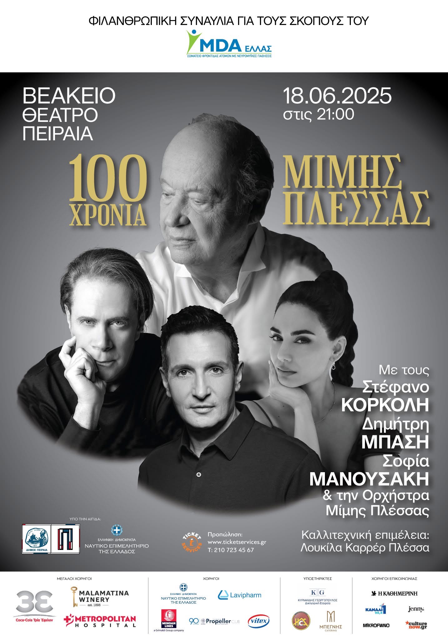 Το MDA Ελλάς, Σωματείο για τη φροντίδα των ατόμων με Νευρομυϊκές Παθήσεις παρουσιάζει την Τετάρτη 18 Ιουνίου και ώρα 21.00 στο Βεάκειο Θέατρο Πειραιά, το μουσικό αφιέρωμα «Ο Αιώνας του Μίμη Πλέσσα» με τους Στέφανο Κορκολή, Δημήτρη Μπάση, Σοφία Μανουσάκη & την Ορχήστρα Μίμης Πλέσσας, σε καλλιτεχνική επιμέλεια της Λουκίλας Καρρέρ Πλέσσα.
